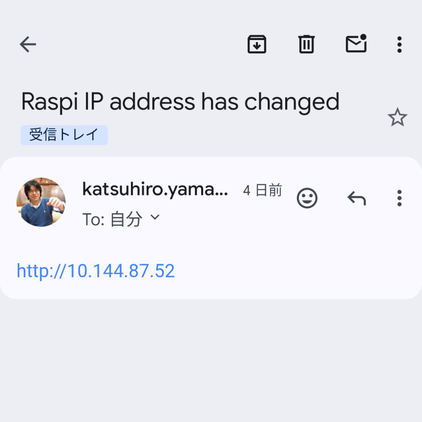 これで、 ラズパイの IP アドレスが変わると、下の様なGmailが届きます。