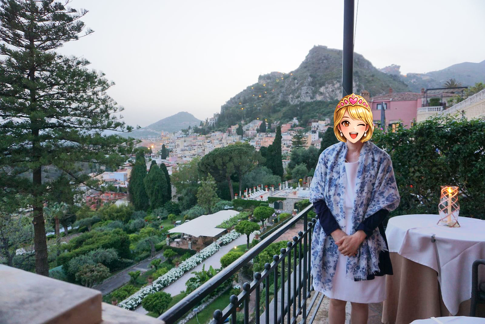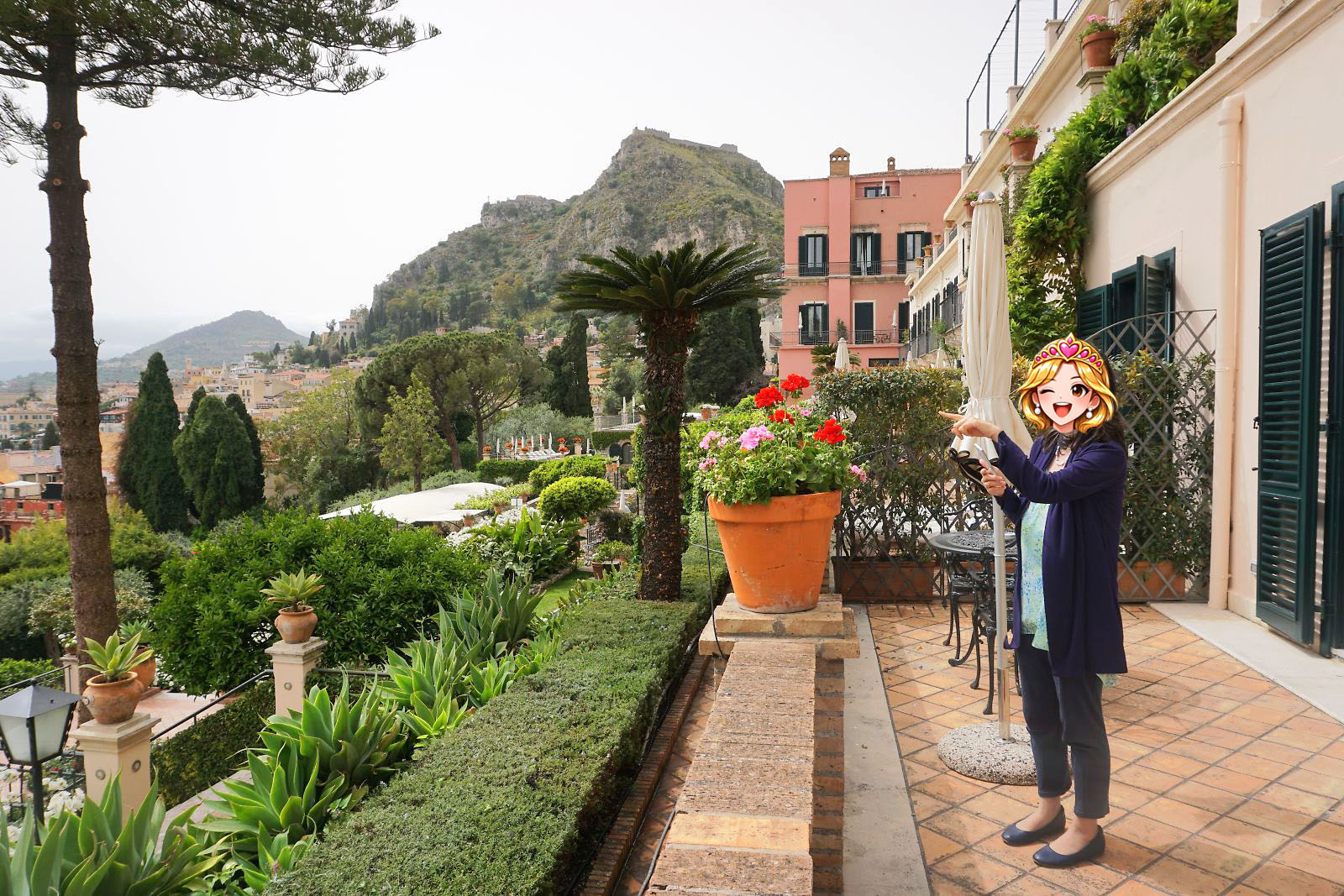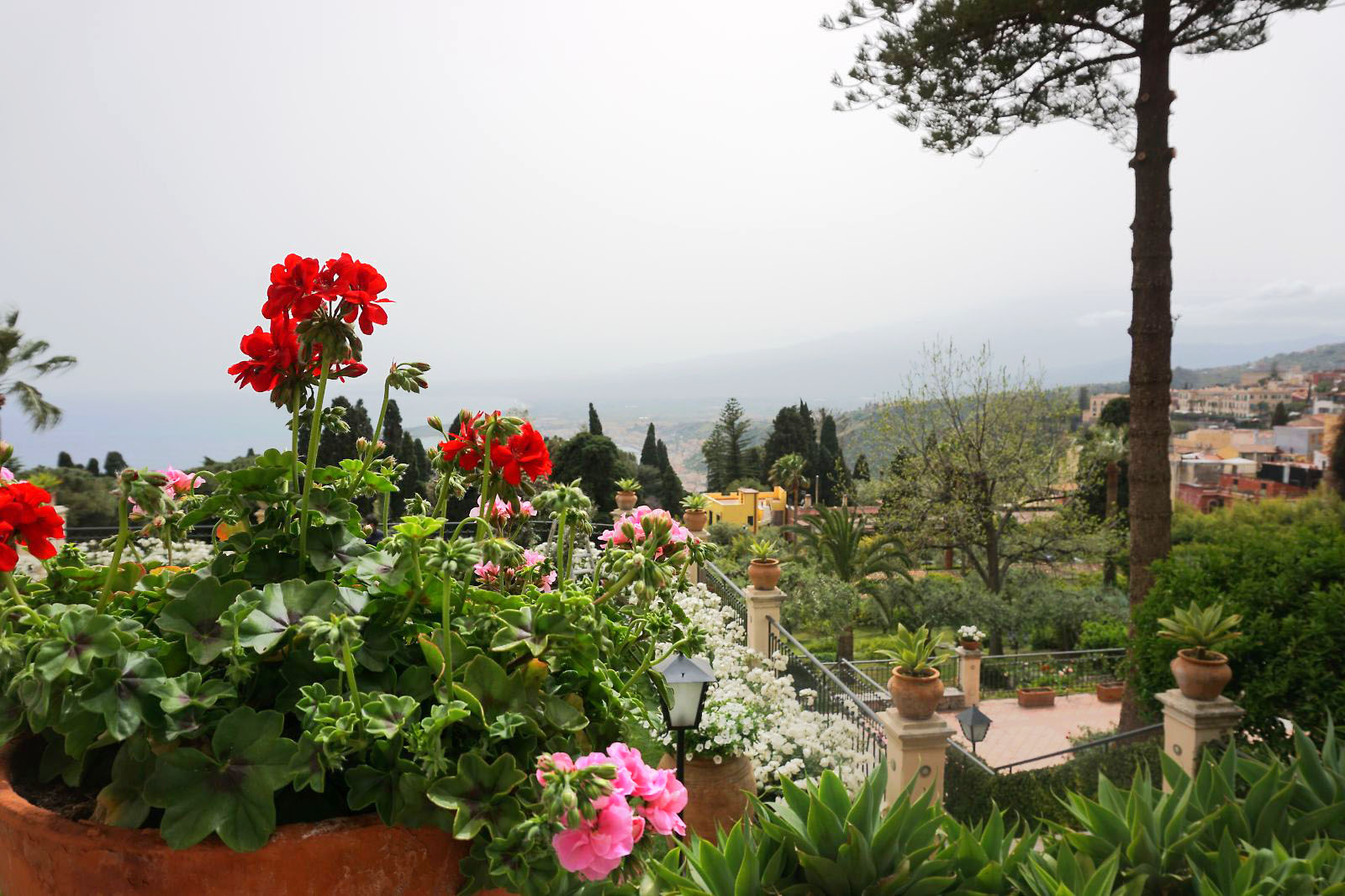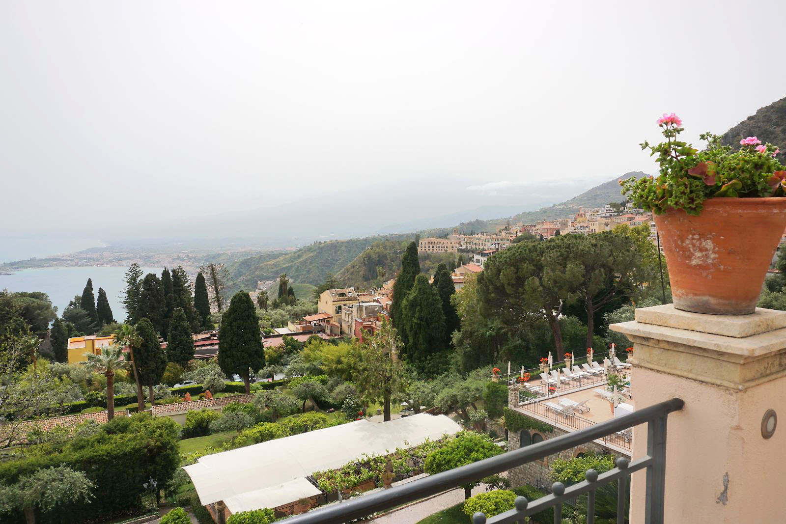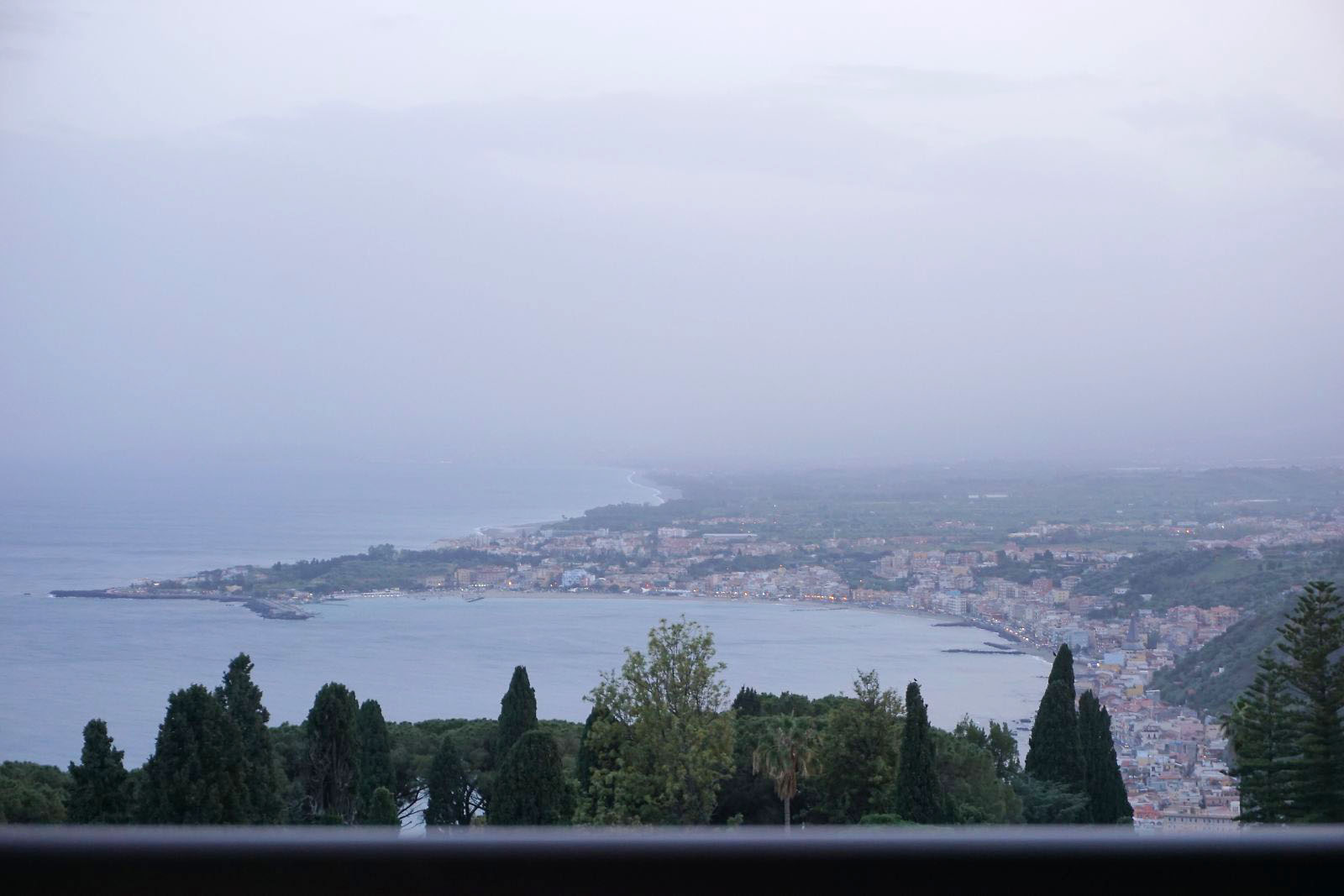 テラスに出ると高台から見渡すタオルミーナの町と遥かエトナ山が見えていた。