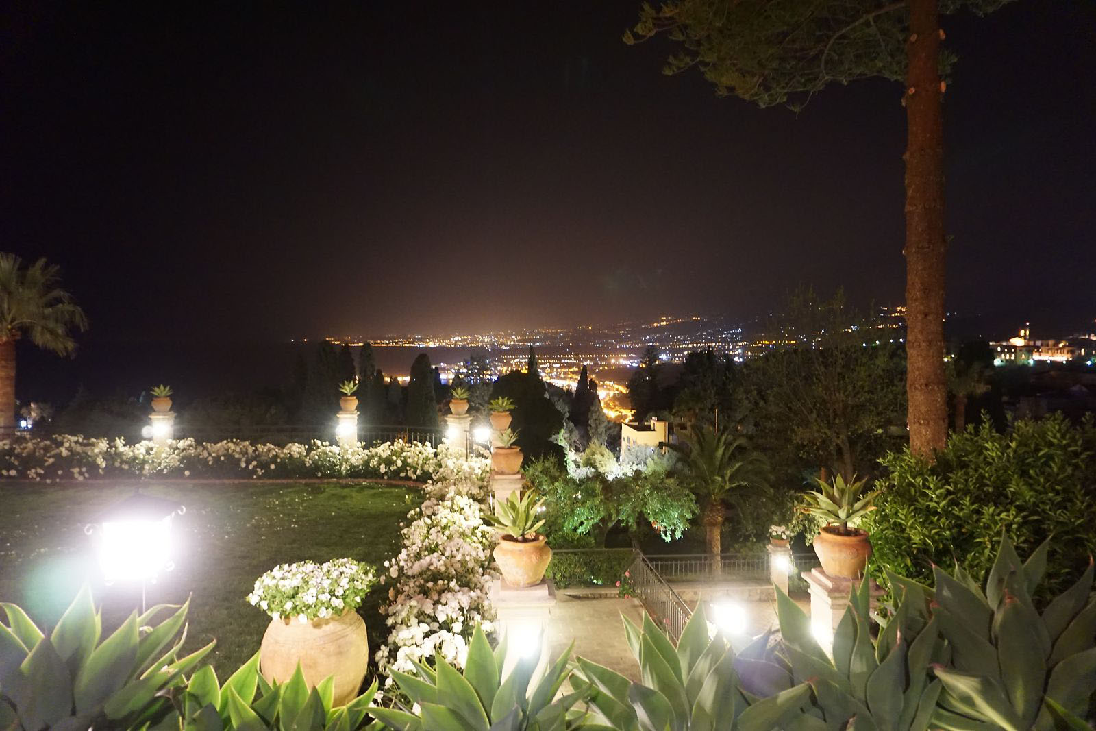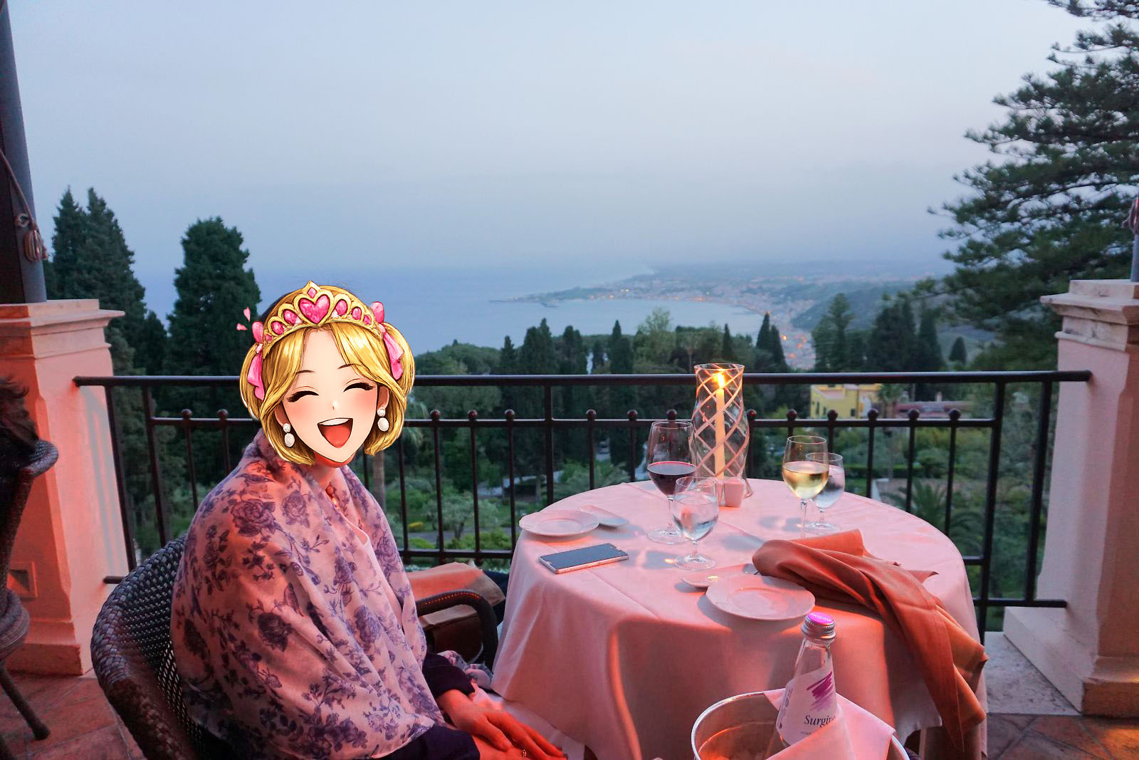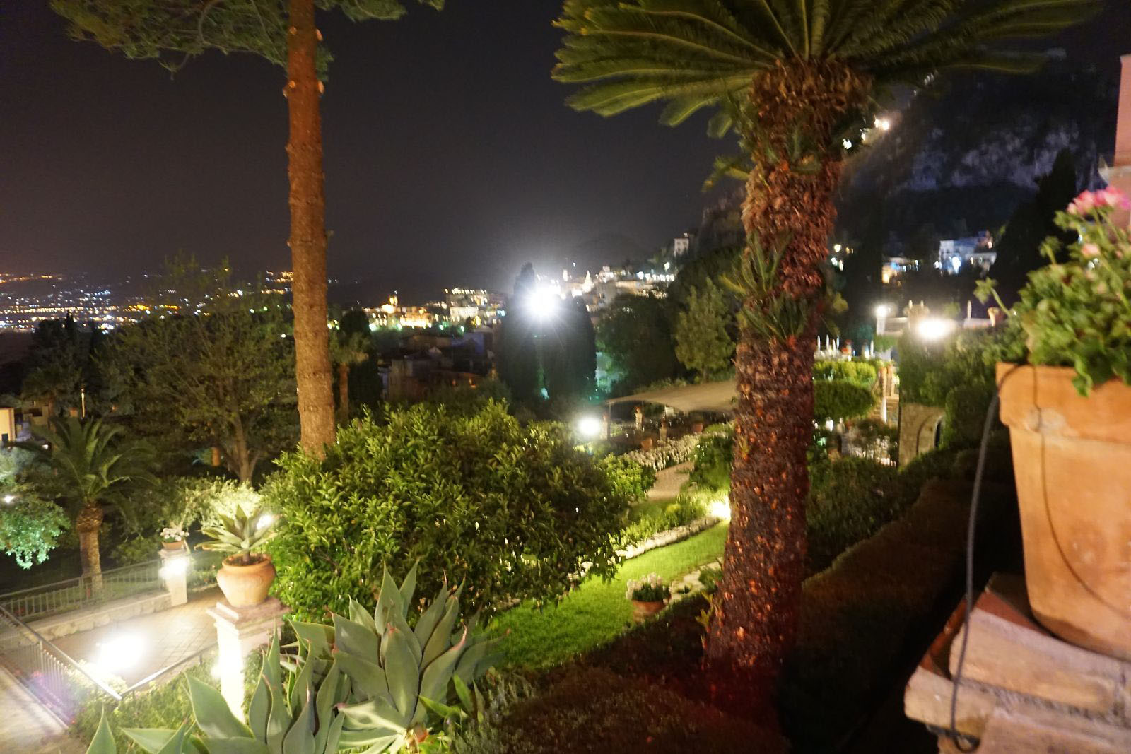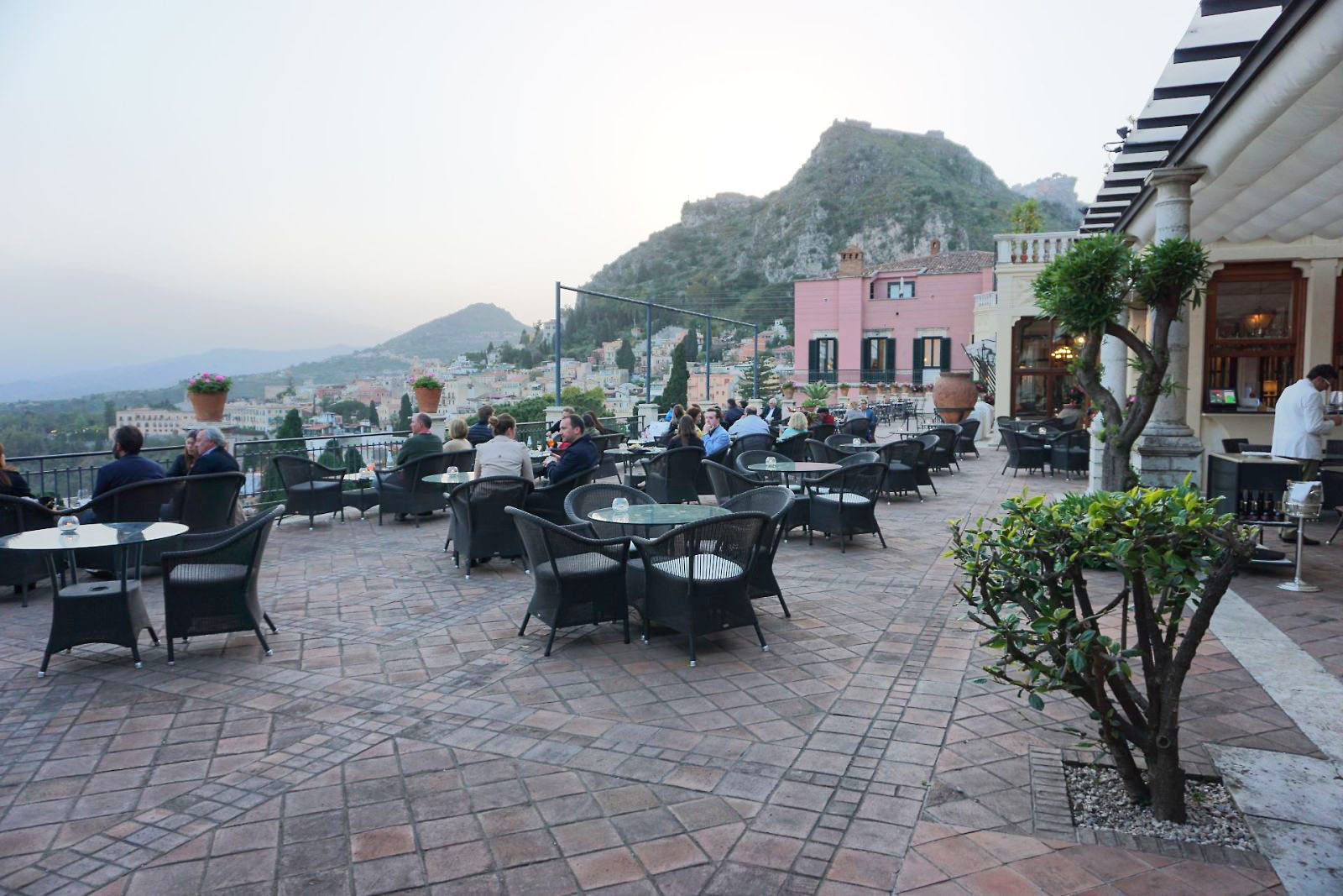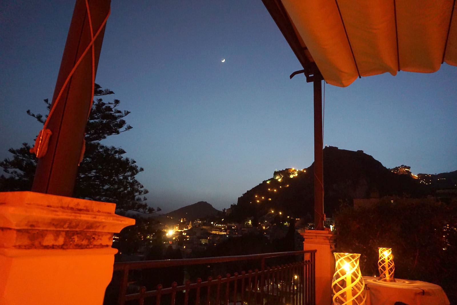 テラスに出ると高台から見渡すタオルミーナの町と遥かエトナ山が見えていた。