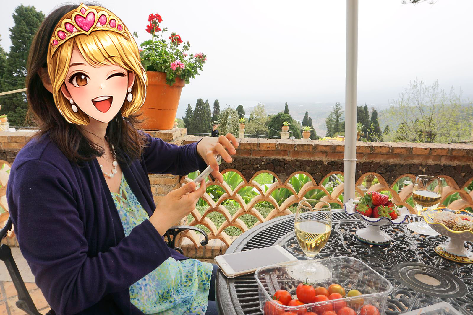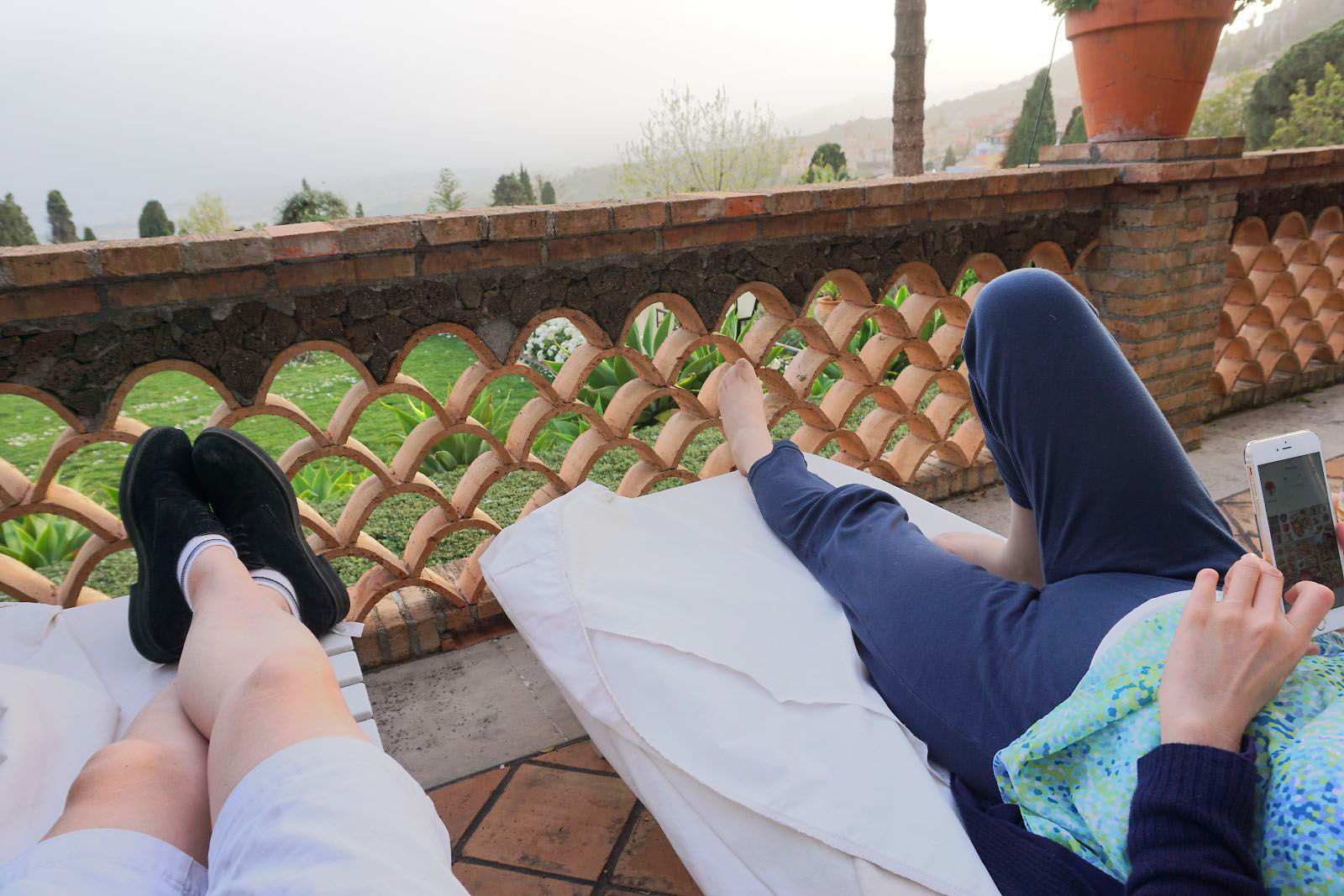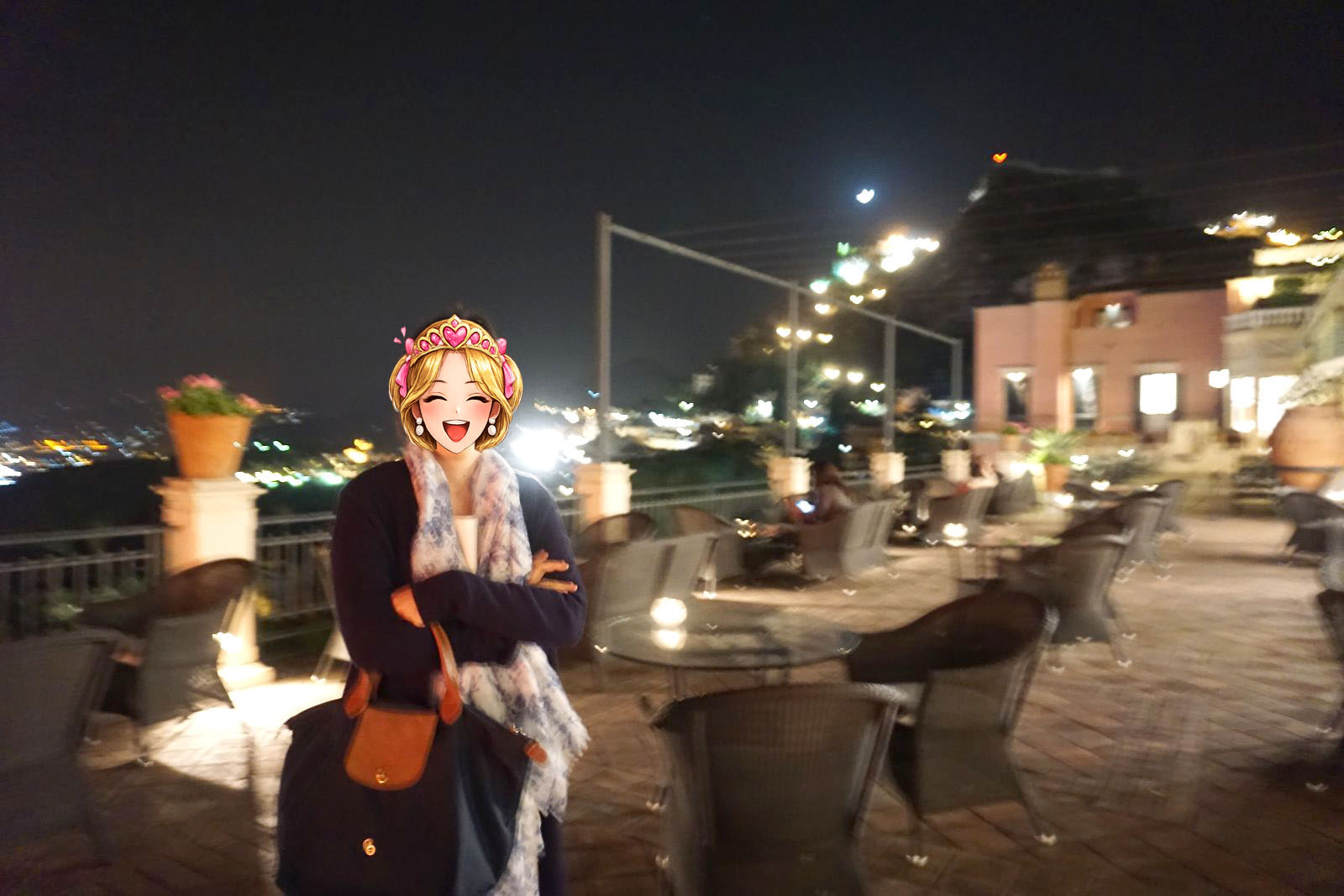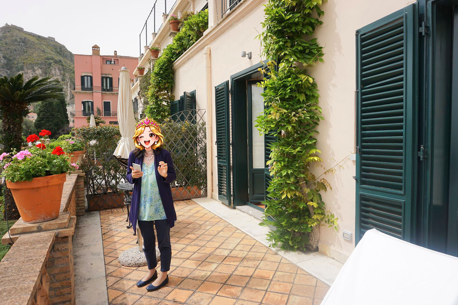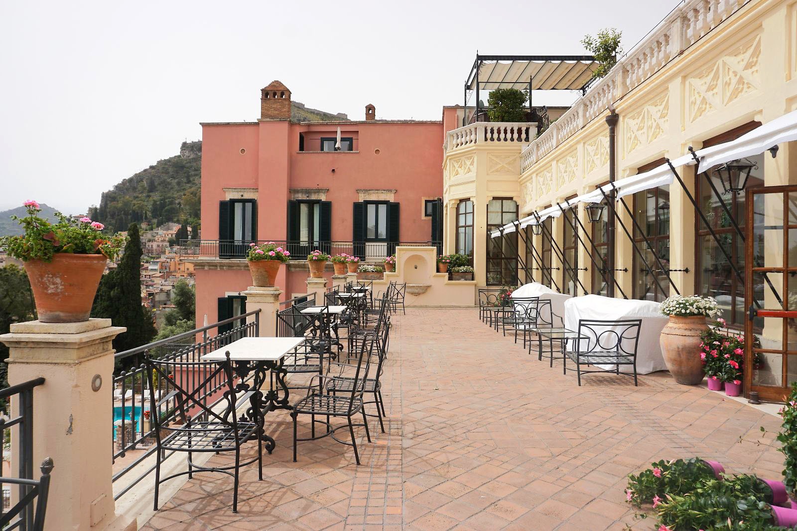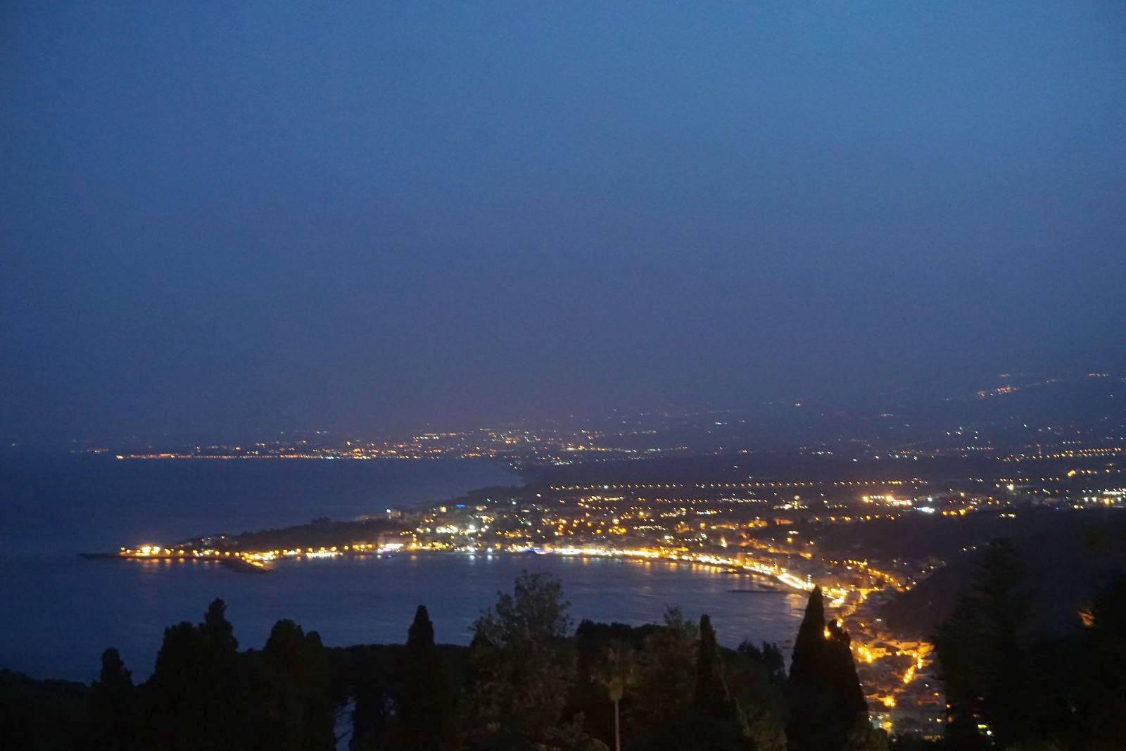 テラスに出ると高台から見渡すタオルミーナの町と遥かエトナ山が見えていた。