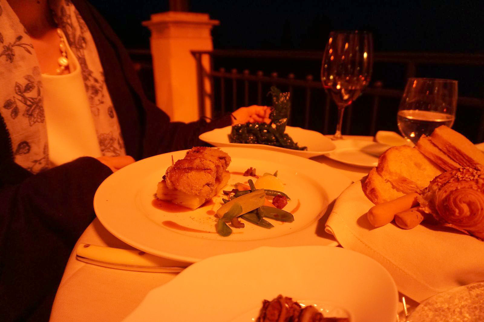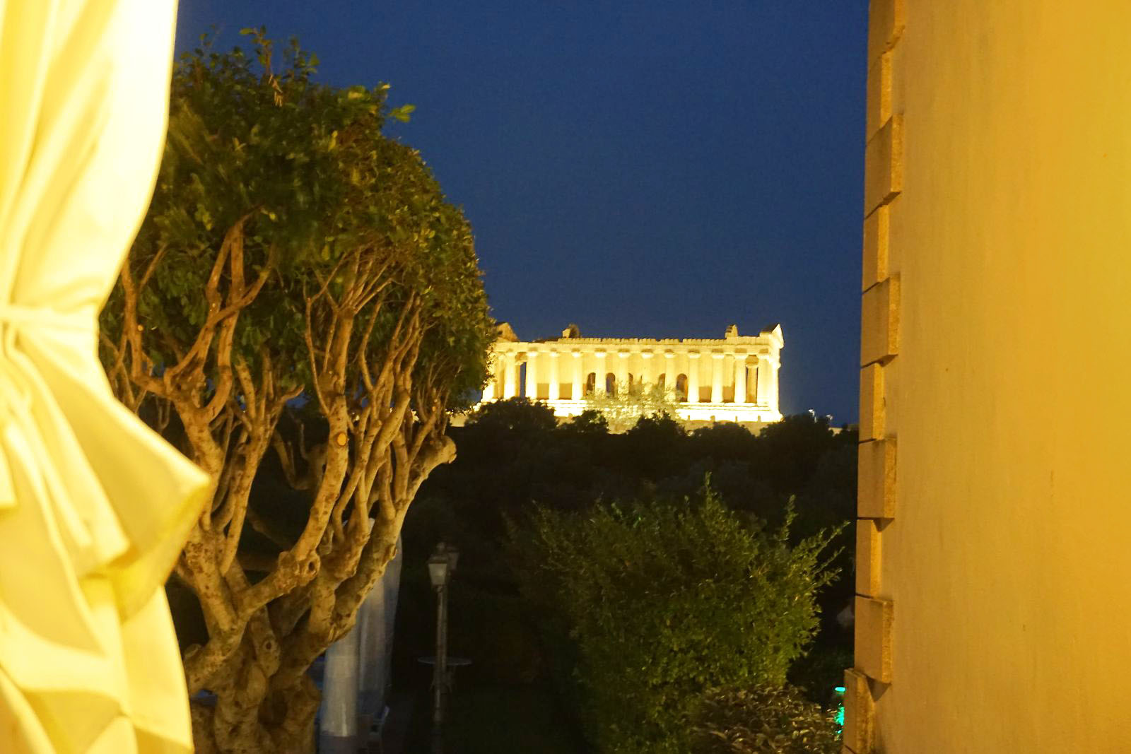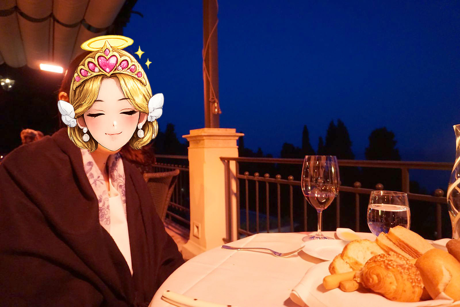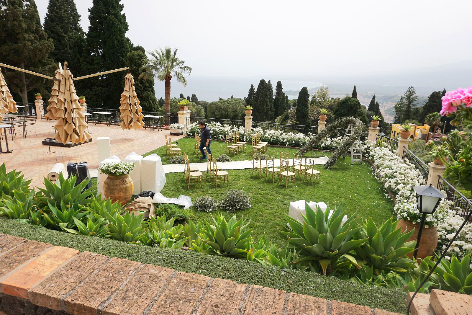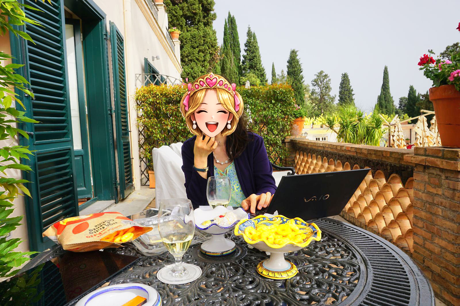 テラスに出ると高台から見渡すタオルミーナの町と遥かエトナ山が見えていた。