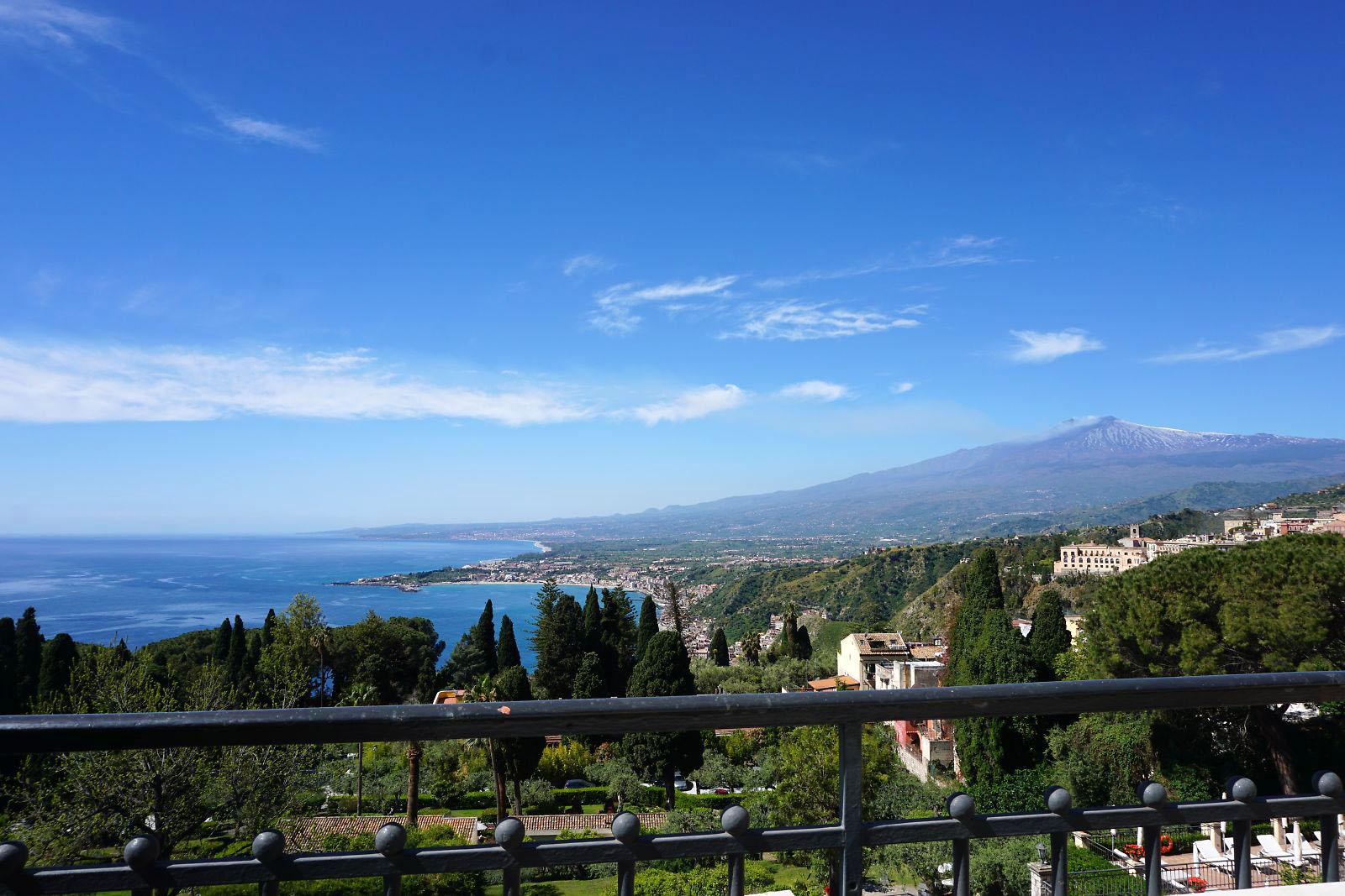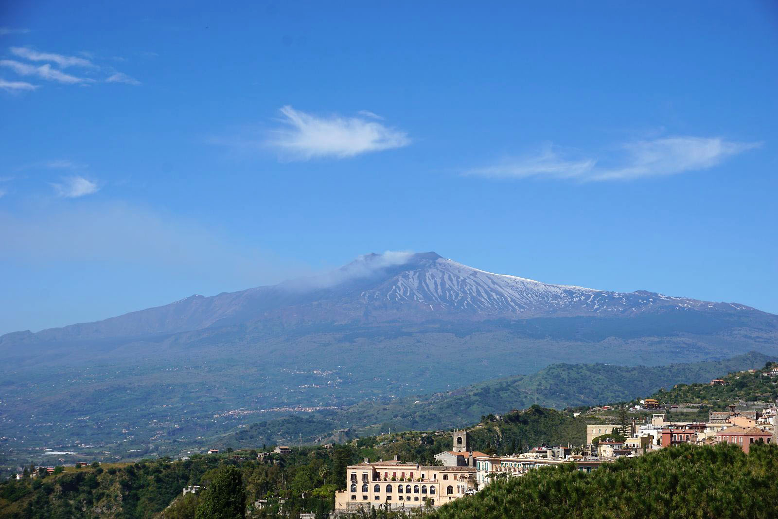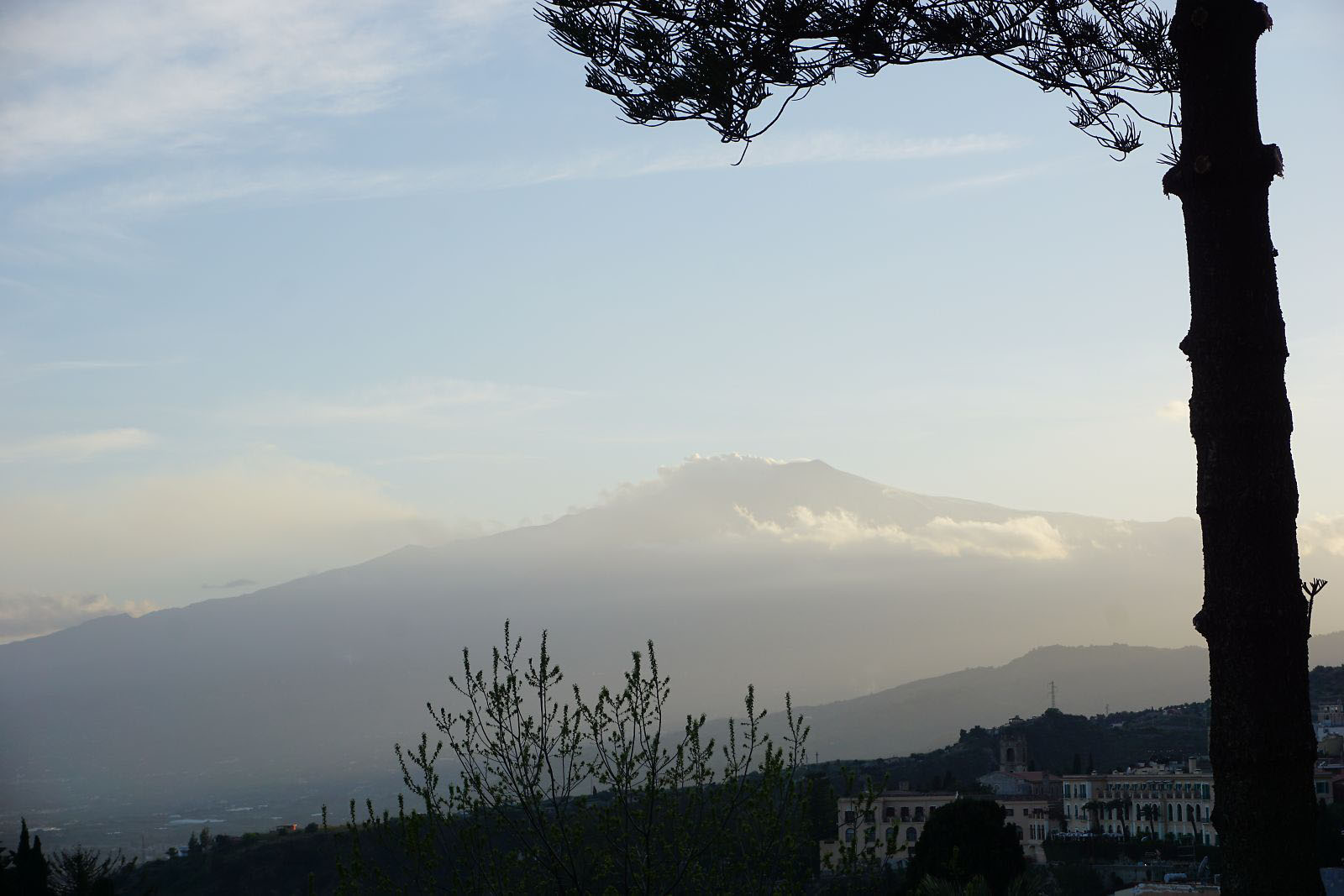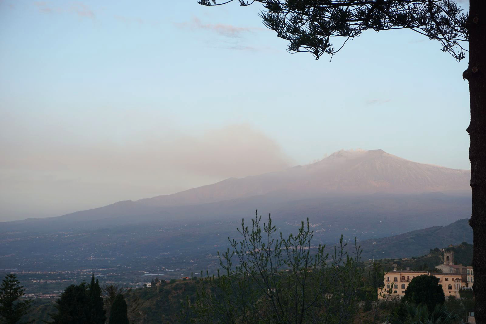 目が覚めテラスに出てみると、今日はかすみが晴れ、エトナ山がくっきりと見えていた。