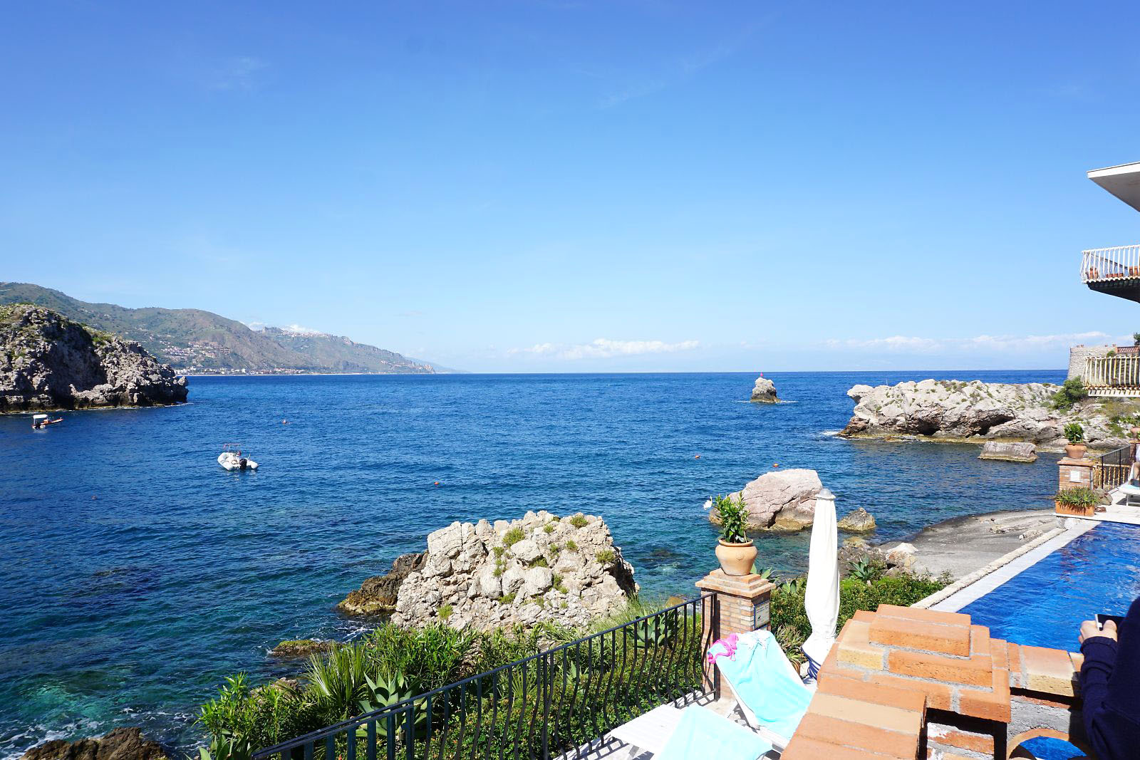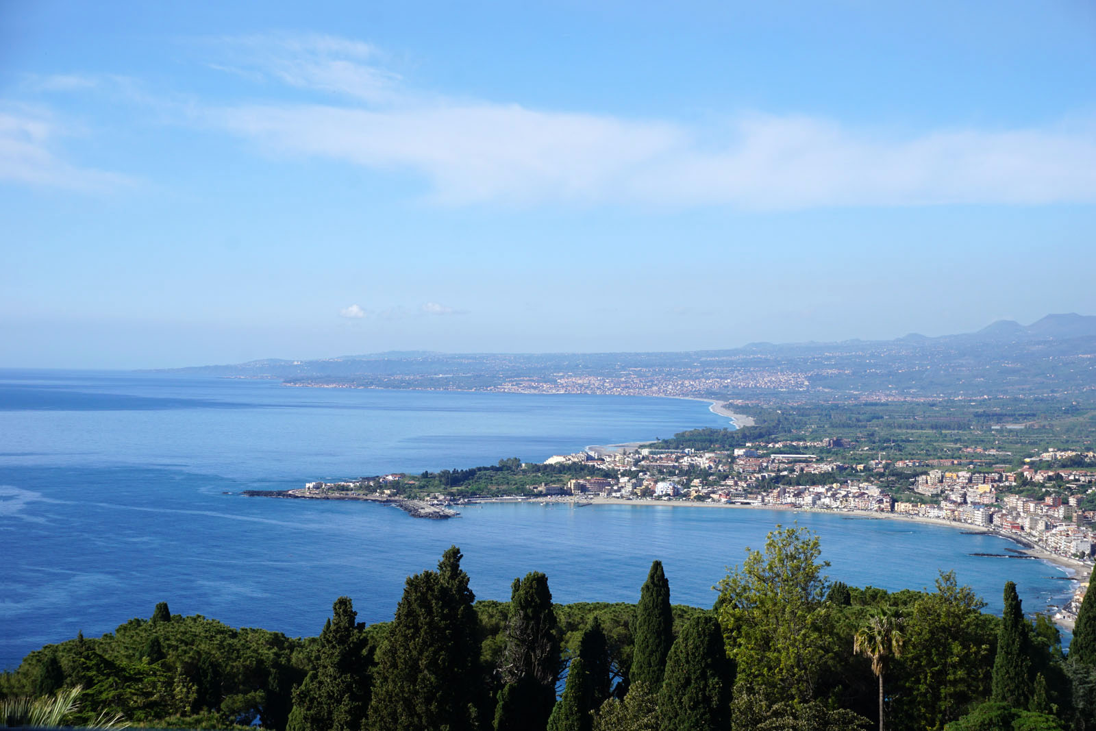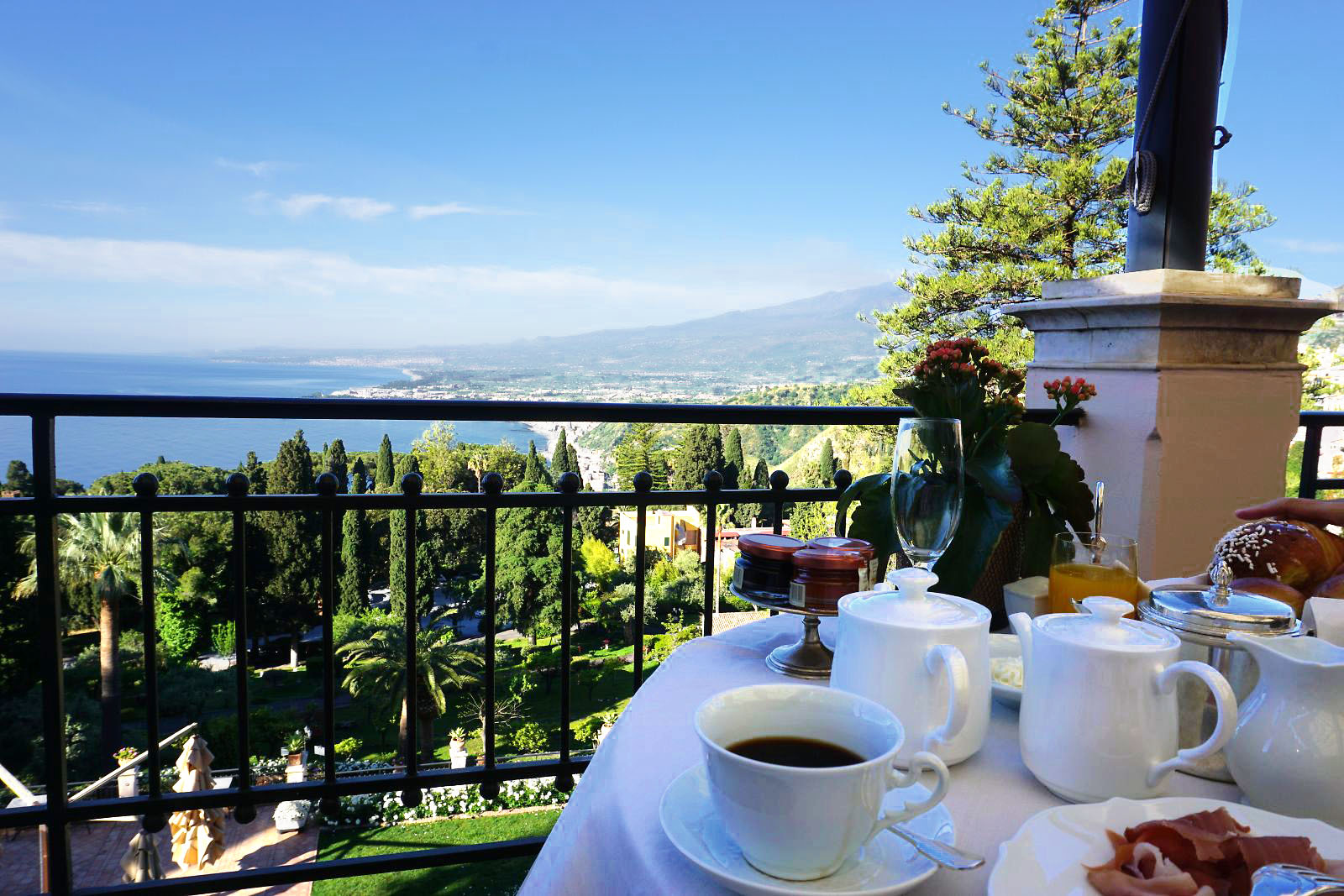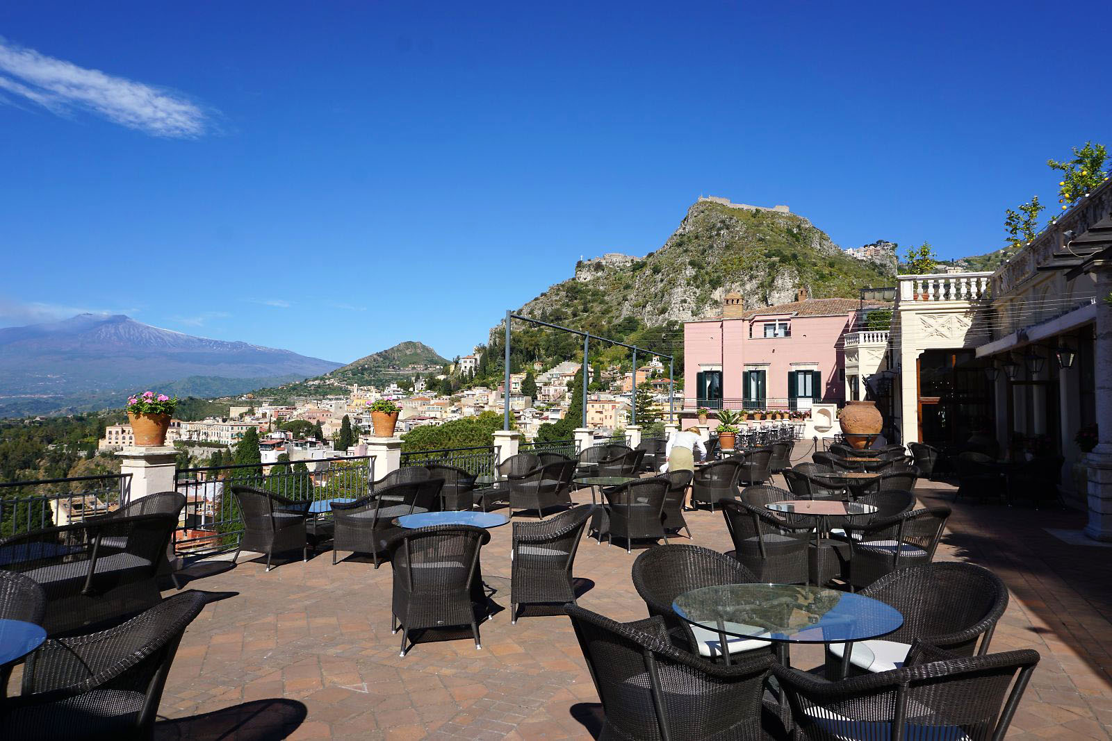 目が覚めテラスに出てみると、今日はかすみが晴れ、エトナ山がくっきりと見えていた。